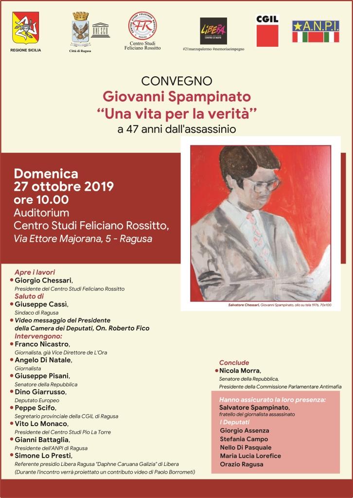 Ragusa, 21 ottobre 2019 – Domenica 27 ottobre 2019, alle ore 10, presso l’Auditorium del Centro Studi “Feliciano Rossitto” (Via Ettore Majorana, 5 – Ragusa) si terrà il convegno avente per tema “Giovanni Spampinato. Una vita per la verità a 47 anni dall’assassinio”. Interverrà il presidente della Commissione parlamentare antimafia sen. Nicola Morra. Ha assicurato la sua presenza Salvatore Spampinato, fratello del giornalista assassinato.