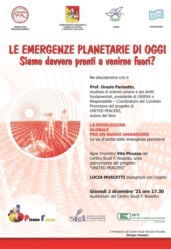 Ragusa, 25 novembre 2021 — Giovedì 2 dicembre 2021, alle ore 17.30, presso l’Auditorium del Centro Studi “Feliciano Rossitto” (Via Ettore Majorana 5, Ragusa) si terrà un incontro con il prof. Orazio Parisotto (studioso di scienze umane e dei diritti fondamentali) sul tema “Le emergenze planetarie di oggi. Siamo davvero pronti a venirne fuori?”.