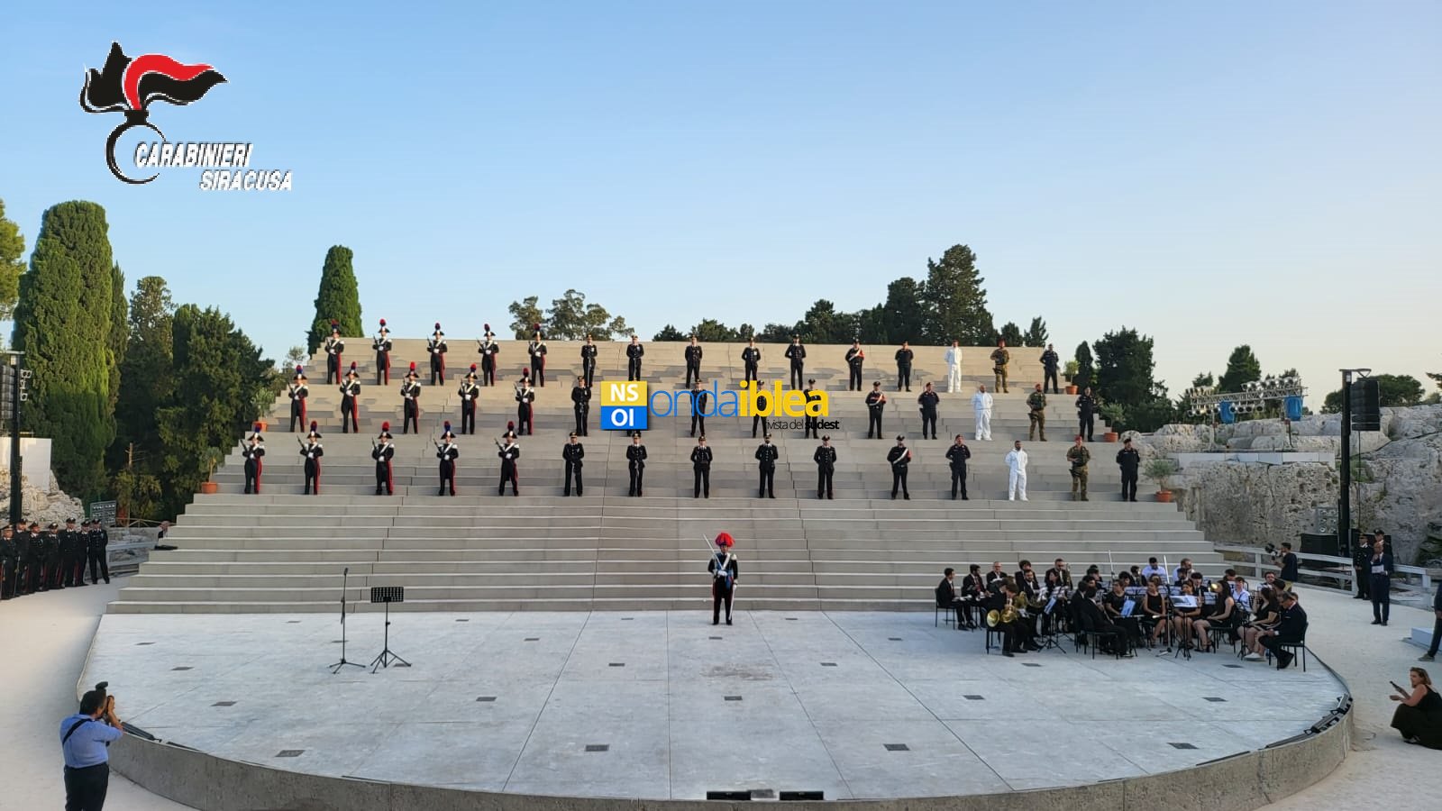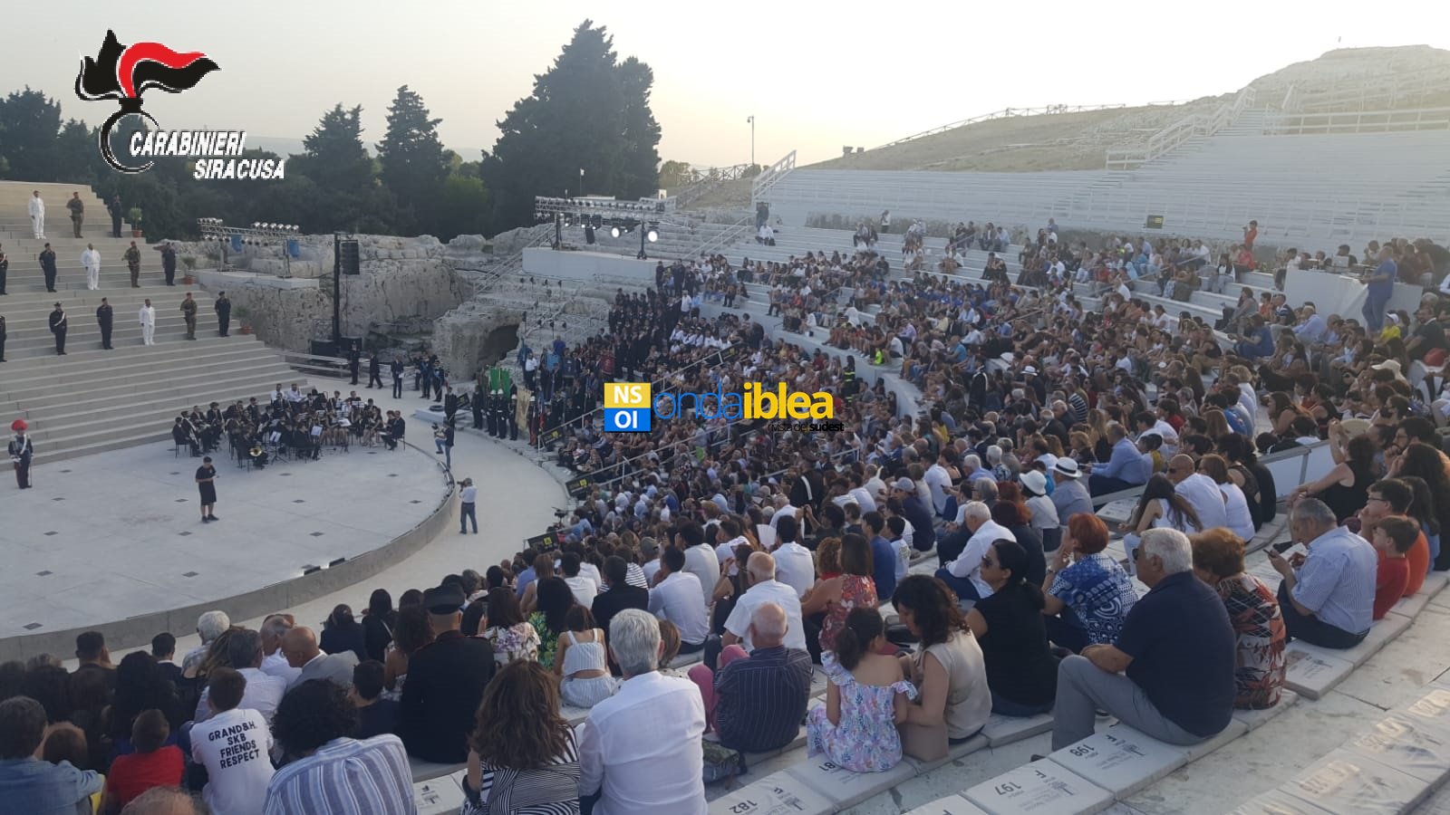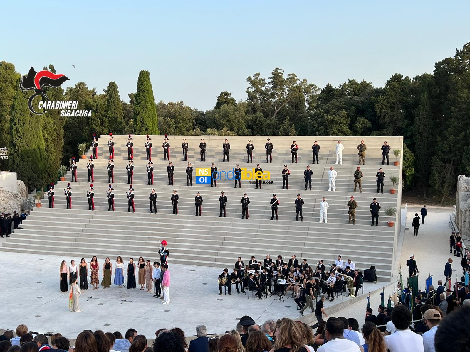 La manifestazione ha avuto inizio alle 19.00, alla presenza di una nutrita rappresentanza di Sindaci dei 21 Comuni della provincia, del Prefetto di Siracusa e delle Autorità civili, militari e religiose. Dopo l’ingresso del Prefetto, un reparto di formazione composto da militari in Grande Uniforme, rappresentanti delle Stazioni Carabinieri della provincia, e da Carabinieri delle varie specialità, oltre che a una rappresentanza dell’Associazione Nazionale Carabinieri e delle altre Associazioni combattentistiche e d’Arma con rispettivi Labari, fra cui quello del Libero Consorzio Comunale e della Città di Siracusa, si è schierato sulla maestosa scalinata che funge da scenografia dell’Edipo Re, in scena in questi giorni.