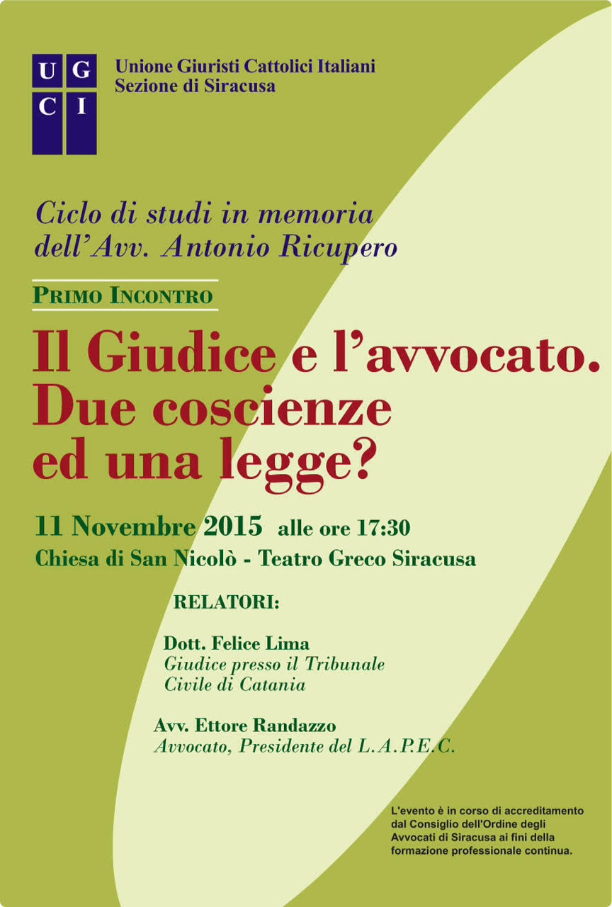 L’incontro è organizzato dalla sezione dell'Unione Giuristi Cattolici Italiani di Siracusa, guidata dal prof. Salvatore Amato, che sta promuovendo un ciclo di studi in memoria dell'avv. Ricupero, del quale si celebra quest'anno il decennale della scomparsa.