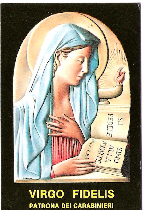 La Vergine Maria fu proclamata Patrona dell’Arma, con il titolo di “Virgo Fidelis”, nel 1949, da Papa Pio XII, il quale, ispirandosi al motto dei Carabinieri “Nei secoli fedele”, ne fissava la celebrazione proprio il 21 novembre, in concomitanza della presentazione di Maria Vergine al Tempio e della ricorrenza della Battaglia di Culqualber, fatto d’armi in cui l’eroismo, fino alla morte, del 1° Battaglione Carabinieri Reali mobilitato in Africa Orientale, composto da due Compagnie Carabinieri, valse alla Bandiera dell’Arma la seconda Medaglia d’Oro al Valor Militare.