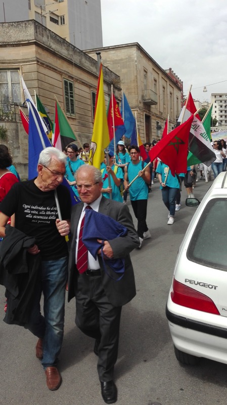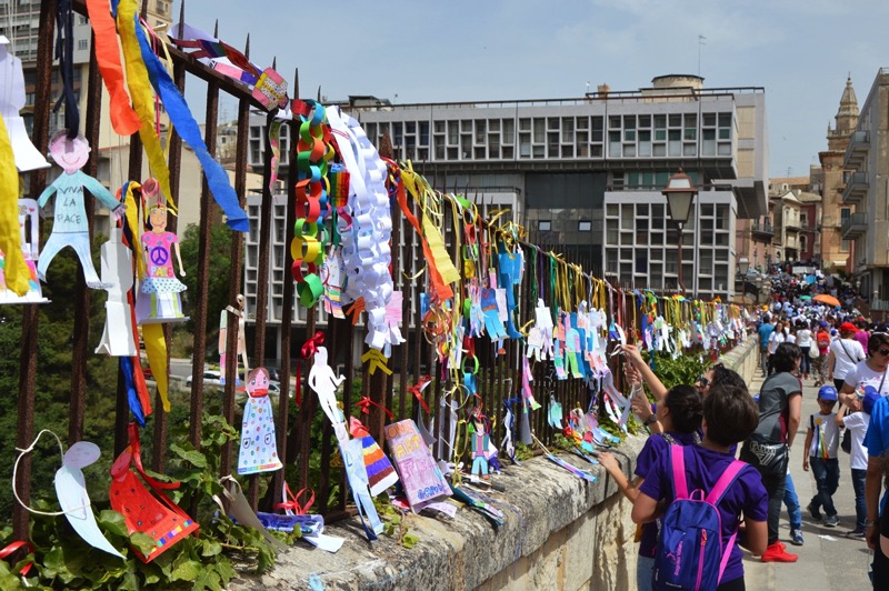 Tutti hanno cantato, ballato, suonato e mostrato slogan di Pace e incuranti del grande caldo che ha caratterizzato questo sabato di maggio , hanno percorso le vie della città: tra la via Roma, piazza Libertà, viale Tenete Lena, via Leonardo da Vinci, Ponte Vecchio, via Mariannina Coffa per poi tornare in piazza San Giovanni. Durante la marcia alcuni “flash mob” hanno animato la passeggiata con musiche, danze e rappresentazioni sceniche. Tra le altre, la posa lungo l’inferriata del ponte Vecchio delle piccole sagome dei “pacifici” disegnati dagli stessi alunni. Un gesto di Pace che come un rito propiziatorio si ripete ogni anno in questo tratto della città, il Ponte Vecchio, dichiarato dall’Unesco sito di Pace poiché la sua costruzione fu un primo segno di unione tra i due quartieri della città separati anticamente dalla grande vallata.