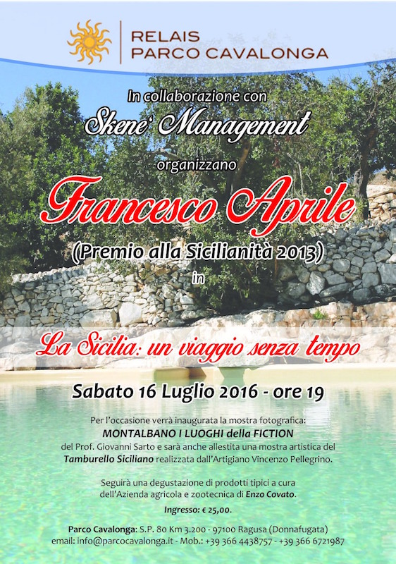 Scicli, 16 giugno 2016 – “La Sicilia, un viaggio senza tempo”: questo il tema della serata artistica organizzata da Relais Parco Cavalonga in collaborazione con Skené Management, che si terrà sabato 16 luglio a partire dalle ore 19. Un tributo alla Sicilia e alla sicilianità, in una cornice incantevole e mozzafiato, quella, appunto, di Parco Cavalonga.