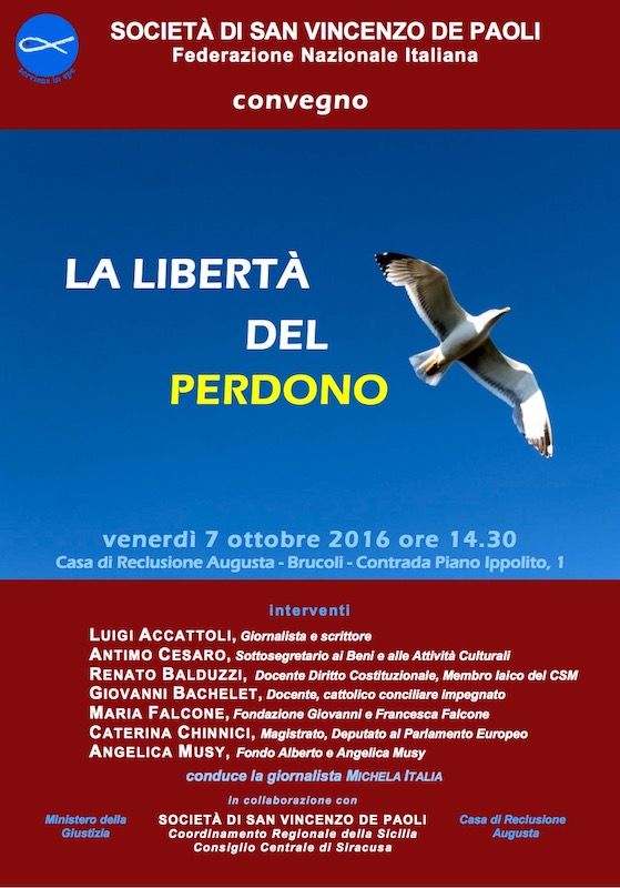 Nel pomeriggio, alle ore 14.30, il convegno dal titolo “La libertà del perdono” che svilupperà il tema del concorso attraverso le relazioni di Luigi Accattoli, giornalista e scrittore; Renato Balduzzi, docente e membro laico del CSM; Giovanni Bachelet, figlio di Vittorio, docente, noto per il suo impegno sociale e politico di cattolico; Maria Falcone, attiva nel promuovere l’educazione alla legalità e all’impegno civile; Caterina Chinnici, magistrato, europarlamentare, figlia del giudice Rocco; Angelica Musy, che attraverso il Fondo intestato alla memoria del marito Alberto opera per il reinserimento di ex detenuti. Interverrà Santi Consolo, Capo Dipartimento dell’Amministrazione Penitenziaria. I lavori saranno introdotti da Antonio Gianfico, presidente nazionale della Società di San Vincenzo de Paoli; Antonio Gelardi, direttore della casa di reclusione di Augusta; Gianfranco De Gesù, Provveditore regionale Amministrazione penitenziaria.