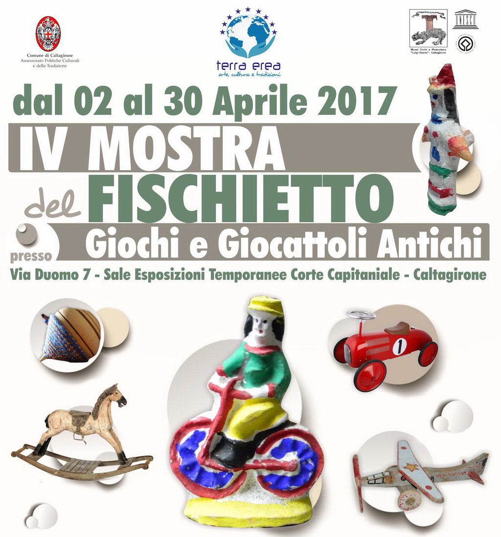 Caltagirone, 31 marzo 2017 – L’associazione culturale “Terra Erea” in collaborazione con i Musei civici e il patrocinio del Comune di Caltagirone inaugurerà il prossimo 2 aprile alle ore 19,00 la Mostra del Fischietto “Giochi e Giocattoli Antichi”, presso le Sale Esposizioni Temporanee della Corte Capitaniale, di via Duomo 7, a Caltagirone.