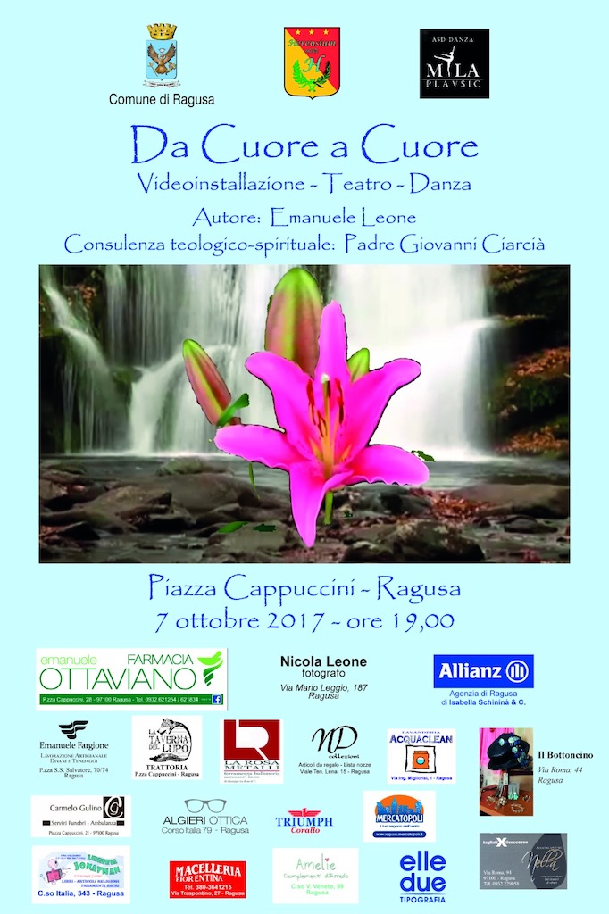 Ragusa, 3 Ottobre 2017 – Il 7 ottobre alle 19 in Piazza Cappuccini, A Ragusa, si terrà la manifestazione “Da cuore a cuore” che unisce l’Arte contemporanea alla Spiritualità tramite video istallazione, teatro, danza. La consulenza teologico-spirituale è di Padre Giovanni Ciarcià.