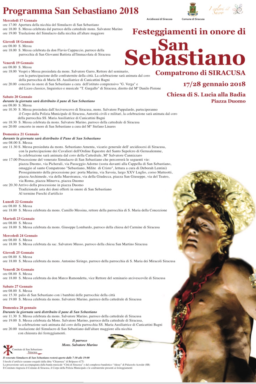 Siracusa, 15 gennaio 2018 – La presentazione dei festeggiamenti in onore del compatrono San Sebastiano avrà luogo oggi, lunedì 15 gennaio, alle ore 11.00 nel Parlatorio delle Monache, annesso alla chiesa di Santa Lucia alla Badia, in piazza Duomo a Siracusa.