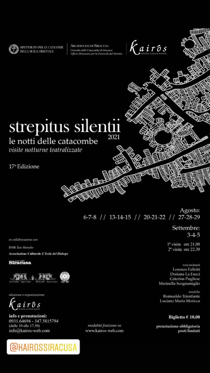 “Strepitus Silentii … le notti delle catacombe” è un progetto promosso dall’Ufficio per la Pastorale del Turismo dell’Arcidiocesi di Siracusa e dalla Custodia della Catacomba di San Giovanni, dall'Ispettorato per le catacombe della Sicilia orientale e dalla società Kairos in collaborazione con l’Istituto Superiore di Scienze Religiose “San Metodio”.