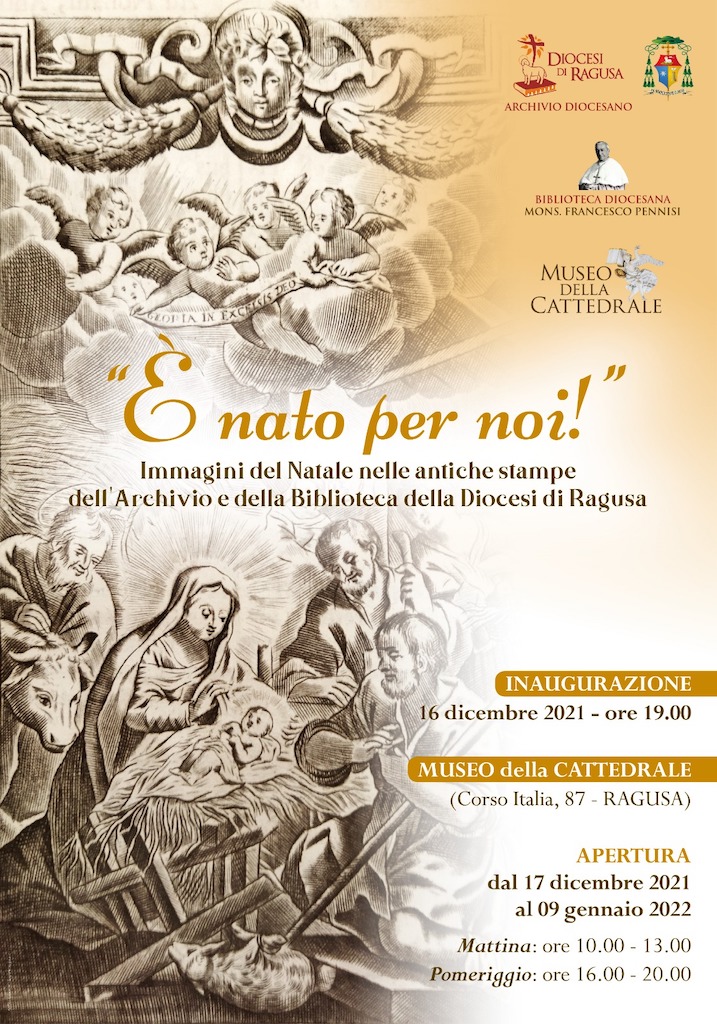 Ragusa, 15 dicembre 2021 — Sarà inaugurata domani alle 19 dal vescovo di Ragusa monsignor Giuseppe La Placa, nei locali del Museo della Cattedrale di corso Italia 87, la mostra di arte sacra “È nato per noi” che raccoglie immagini del Natale nelle antiche stampe. La mostra si potrà visitare sino al prossimo 9 gennaio dalle 10 alle 13 e dalle 16 alle 20. L’iniziativa è promossa dall’Archivio diocesano, dalla Biblioteca diocesana “Monsignor Francesco Pennisi” e dal Museo della Cattedrale.