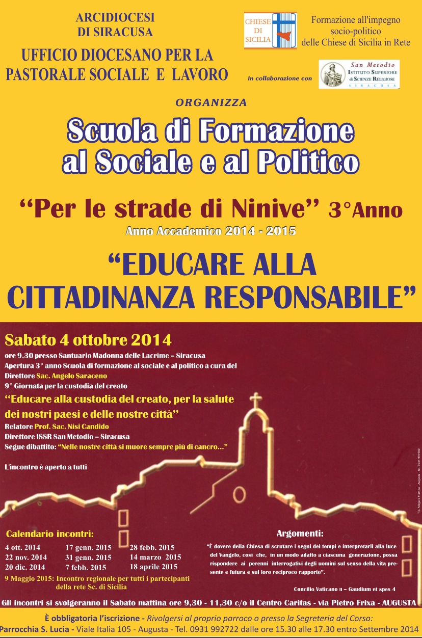 Siracusa, 4 ottobre 2014 – Al via oggi la Scuola diocesana per la formazione al sociale e al politico “Per le strade di Ninive” giunta ormai al terzo anno, promossa dall’Ufficio per la pastorale sociale e del lavoro, giustizia, pace e salvaguardia del creato dell’Arcidiocesi di Siracusa.