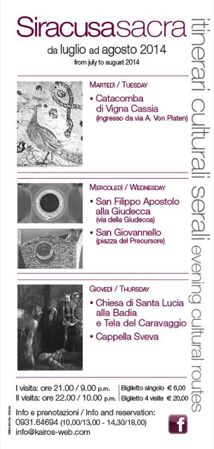 Le novità di quest'anno riguardano la visita della Catacomba di Vigna Cassia, sito risalente al III secolo d.C. e il percorso ortigiano che include anche la Cappella Sveva ed il Carcere Vescovile.«È un modo per diversificare l'offerta per i turisti, ma anche per i tanti siracusani che vogliono riscoprire la città e gli angoli più suggestivi - ha spiegato Piero Cavallaro della Kairós -. L'idea degli itinerari guidati serali ha già riscosso un notevole successo negli ultimi anni, raccogliendo il plauso di turisti e siracusani; questi ultimi hanno potuto cogliere l'occasione per riscoprire alcuni tesori nascosti della nostra città».