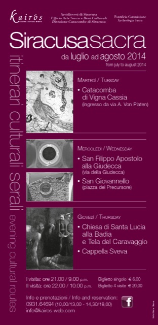 L’Ufficio Arte Sacra e Beni Culturali della Diocesi di Siracusa e la Direzione delle Catacombe di Siracusa in collaborazione con la Pontificia Commissione Archeologia Sacra e Kairos Turismo Cultura Eventi propongono “Siracusa sacra”, per offrire momenti di spiritualità, visitando la catacomba di Vigna Cassia, il complesso di San Filippo apostolo alla Giudecca (inclusi Cripta e pozzo ebraico), la chiesa di San Giovanni Battista detta “San Giovannello”, la chiesa di Santa Lucia alla Badia con la tela del Caravaggio, la Cappella Sveva ed il Carcere Vescovile.