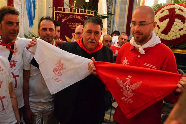 Più volte, durante la processione, intonato dai portatori, con indosso le classiche magliette bianco e rosse che riprendono i colori caratteristici associati alla festa di San Giorgio, è risuonato il grido “Truonu viva” [Viva il Patrono!, ndr], enunciazione tesa ad esaltare tutta la passione nutrita dai devoti nei confronti del santo cavaliere.