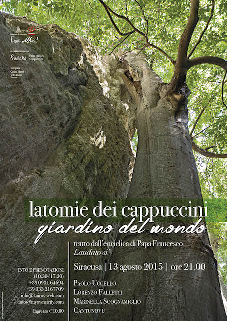 Sarà Paolo Uccello, etnologo e guida naturalistica, la voce del luogo, voce della terra, che racconterà le particolarità della latomia, mentre Marinella Scognamiglio e Lorenzo Falletti saranno le due voci che leggeranno alcuni passi dell’enciclica di Papa Francesco. Il sottofondo musicale sarà dei Cantunovu.