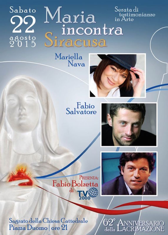 Domenica, 22 agosto 2015 – Al via da oggi alle ore 21, con la serata "Maria incontra Siracusa", i festeggiamenti per il 62° anniversario della Lacrimazione di Maria a Siracusa.