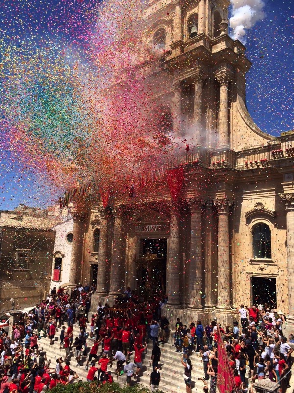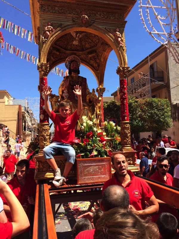 A mezzogiorno il simulacro del Patrono è “venuto giù” dopo l’uscita dalla chiesa di San Bartolomeo con un fragore di mortaretti e un diluvio di “nzaireddi” [bigliettini votivi, ndr], caratteristiche strisce in carta di vari colori, con il rosso a predominare.