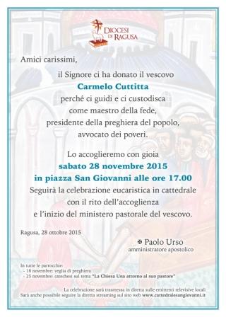 #Ragusa, 24 novembre 2015 – Sabato 28 novembre alle ore 17 in piazza San Giovanni a Ragusa, verrà data festosa accoglienza al nuovo Vescovo, monsignor Carmelo Cuttitta, al quale saranno rivolti il saluto del Sindaco di Ragusa, ing. Federico Piccitto, anche a nome dei Sindaci dei comuni della Diocesi, e quello di una famiglia della comunità diocesana, a nome di tutta la chiesa locale. Di seguito, dal Vescovado partirà la processione dei sacerdoti e dei Vescovi fino in Cattedrale per la celebrazione di insediamento del vescovo Carmelo Cuttitta.