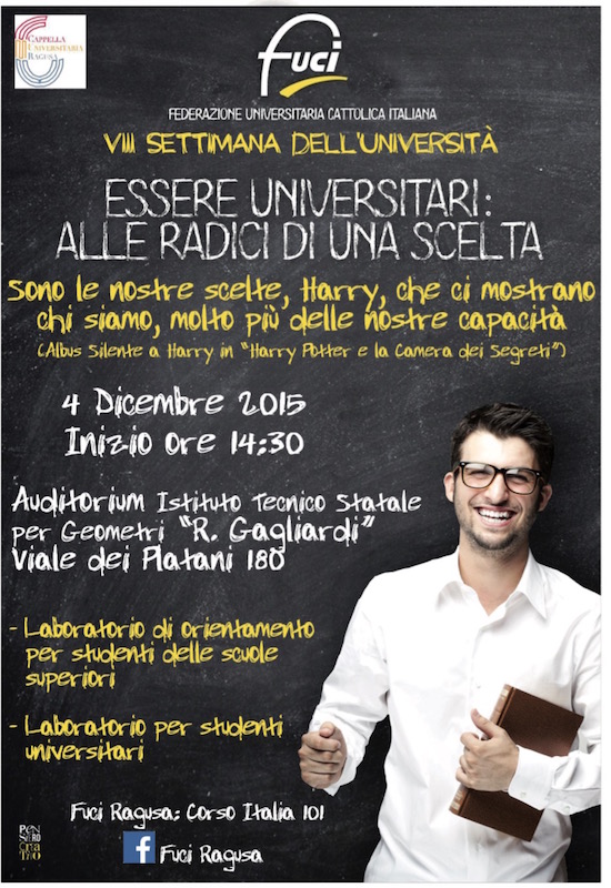 #Ragusa, 3 dicembre 2015 – La Federazione Universitaria Cattolica Italina della Diocesi di Ragusa informa che venerdì 4 dicembre alle ore 14.30, presso l'auditorium dell'Istituto Tecnico per Geometri "R. Gagliardi" di Ragusa (viale dei Platani 181) si svolgerà l'incontro "Essere universitari: alle radici di una scelta", organizzato dal gruppo FUCI di Ragusa.