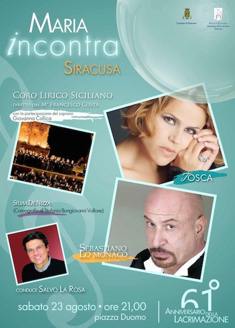 La presentazione dell'evento, che vedrà la partecipazione tra gli altri di Tosca e Sebastiano Lo Monaco, e del Coro Lirico Siciliano diretto dal maestro Francesco Costa, avverrà sabato prossimo, 23 agosto, alle ore 11.00, nei saloni del Santuario della Madonna delle Lacrime. Si tratta di una serata organizzata dalla Basilica Santuario della Madonna delle Lacrime e dal Comune di Siracusa. Saranno presenti il rettore, don Luca Saraceno; il vicesindaco e assessore alle politiche culturali, Francesco Italia; e gli artisti Tosca e Sebastiano Lo Monaco.
