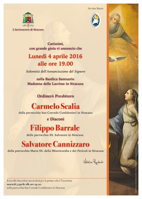 #Siracusa, 4 aprile 2016 – Oggi alle ore 19.00, nella Basilica Santuario Madonna delle Lacrime a Siracusa, l’arcivescovo monsignore Salvatore Pappalardo ordinerà presbitero Carmelo Scalia della parrocchia di San Corrado Confalonieri a Siracusa.