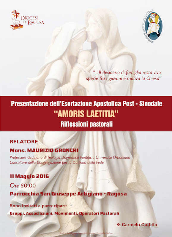 Ragusa, 9 maggio 2016 – Mercoledì 11 maggio sarà presente a Ragusa Mons. Maurizio Gronchi, professore ordinario di Teologia Dogmatica presso la Pontificia Università Urbaniana e Consultore della Congregazione per la Dottrina della Fede, per presentare l’esortazione apostolica post-sinodale di Papa Francesco dal titolo “Amoris Laetitia”.