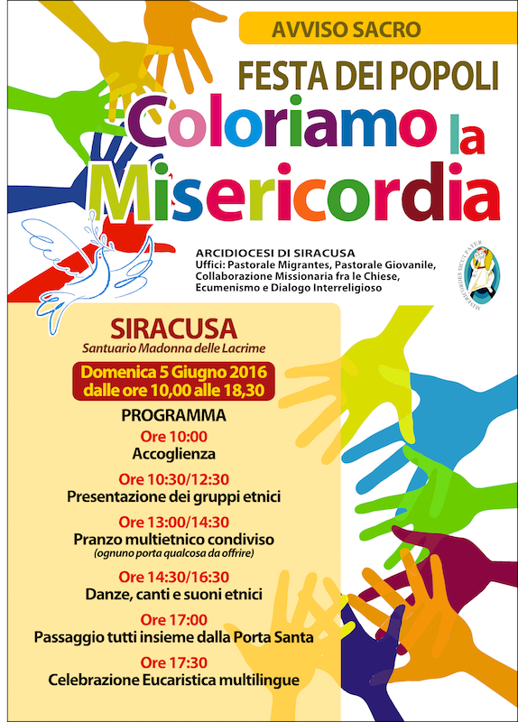 Siracusa, 4 giugno 2016 – Domani, domenica 5 giugno dalle 10.00 alle ore 18.30 alla Basilica Santuario della Madonna delle Lacrime sarà Festa dei popoli.