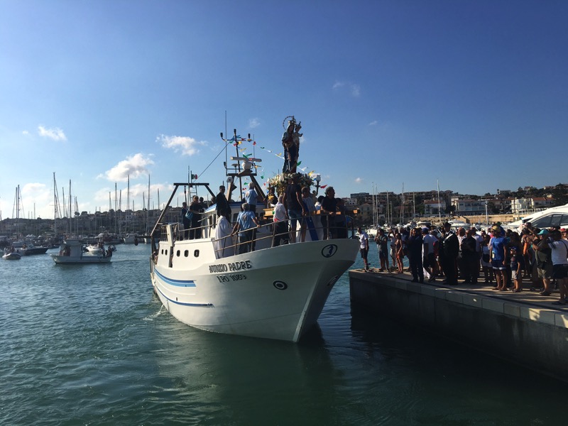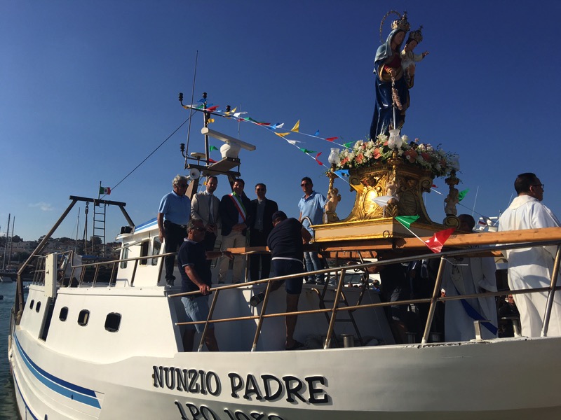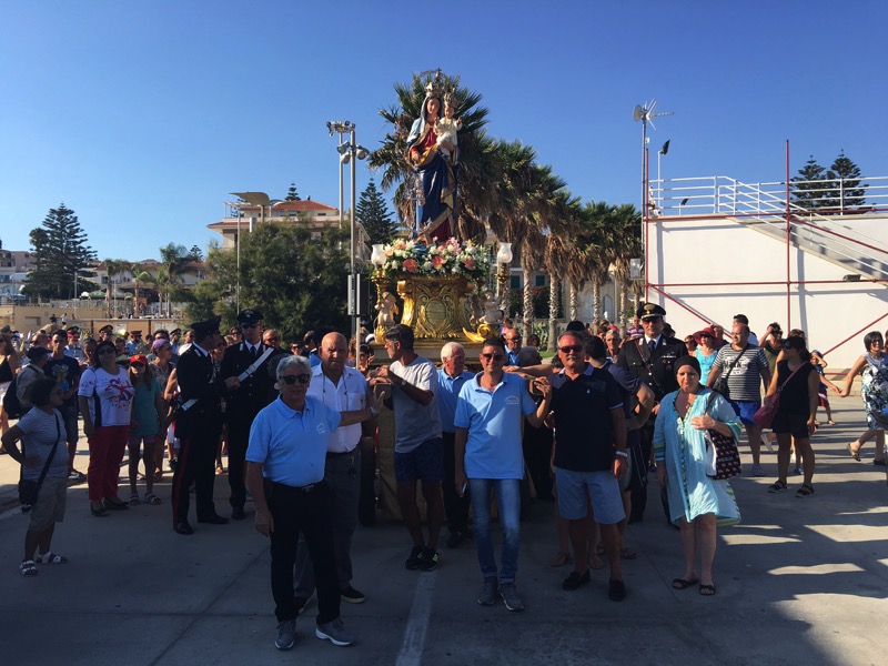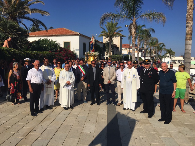 Subito dopo l’imbarco, il parroco, don Mauro Nicosia, ha letto la benedizione al mare. “Noi ti benediciamo e ti rendiamo grazie – ha declamato tra l’altro il sacerdote – Dio di provvidenza infinita, per i grandi segni del tuo amore profusi nel corso dei secoli sulle generazioni umane che hanno solcato le vie del mare. Per tua grazia, Signore, i nostri padri, che ci trasmisero i segreti del navigare, ci hanno insegnato a vedere nell’immensità delle acque le orme della tua presenza; e con gli strumenti di quella difficile arte ci hanno consegnato la bussola della fede e il timone della speranza”. Dopo lo sbarco, la stessa processione è proseguita per le vie della frazione rivierasca sino al rientro in chiesa a tarda sera contrappuntato, a mezzanotte e mezza, dallo sparo di fuochi d’artificio.