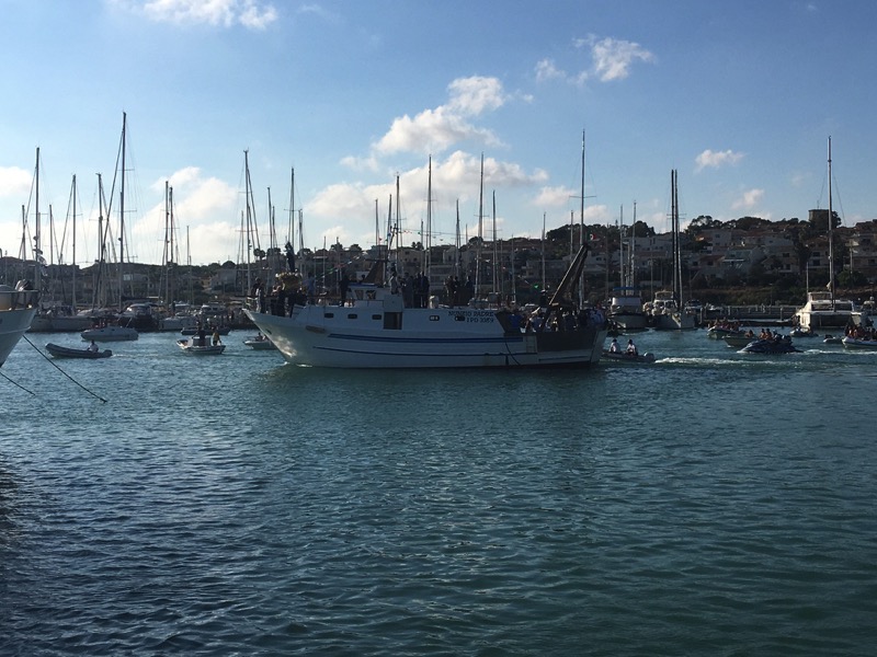 Il simulacro imbarcato al porto, seguito da una miriade di natanti piccoli e grandi, ha seguito il percorso della processione a mare nella maniera più adeguata con grande partecipazione lungo l’intero tratto di costa, dallo specchio di mare antistante il lungomare Andrea Doria e Bisani sino al villaggio Santa Barbara e Punta di Mola.