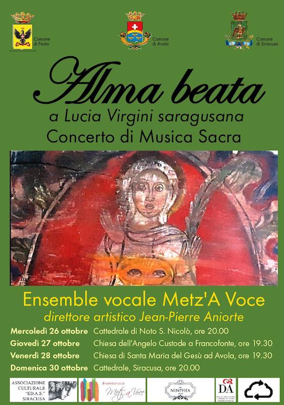 Siracusa, 24 ottobre 2016 – L'Associazione Ninphea Onlus, in collaborazione con l'associazione Ensemble Voce di Metz'A (Francia), l'associazione Dante Alighieri , l' associazione ED.A.S., con i patrocini del Comune di Siracusa, Noto ed Avola, è lieta di presentare il concerto di musica sacra “Alma Beata, a Lucia virgini saragusana”.