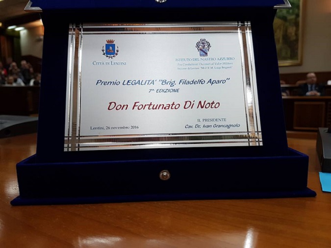 A don Fortunato di Noto il premio Legalità "Brigadiere Filadelfo Aparo"