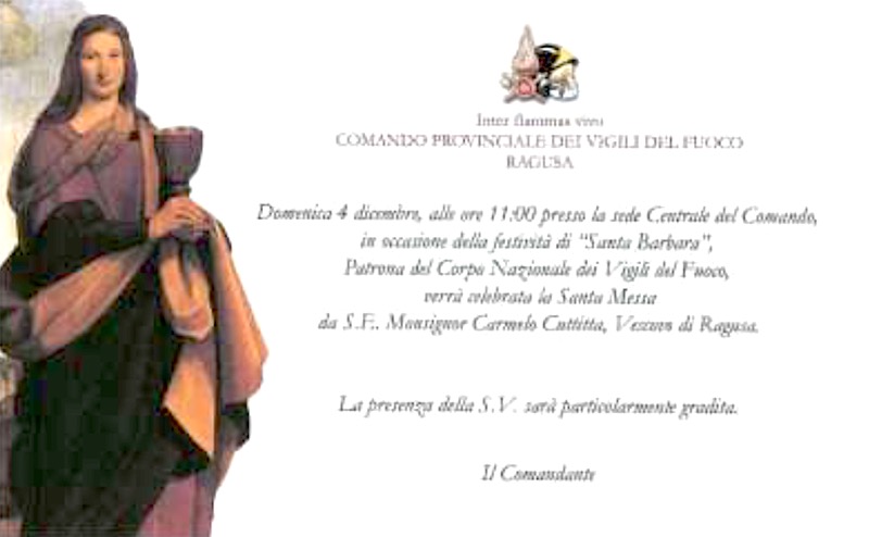 Ragusa, 30 novembre 2016 – Come tradizione, anche quest’anno, domenica 4 Dicembre, sarà celebrata la ricorrenza di S.Barbara patrona dei Vigili del Fuoco.