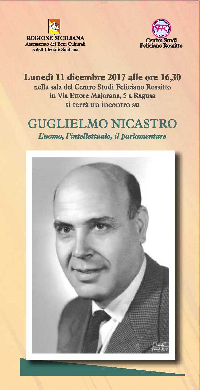 Lunedì 11 dicembre 2017 alle ore 16.30, nella sala del Centro Studi Feliciano Rossitto, in Via Ettore Majiorana, 5 – Ragusa, si terrà un incontro dal titolo “Guglielmo Nicastro. L’uomo, l’intellettuale, il parlamentare”.