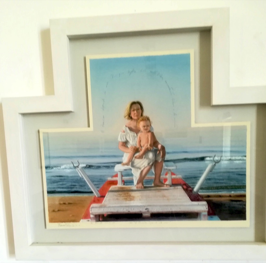 Tutto il tema verrà infatti svolto dall’artista in varie opere tra cui quella della genesi. Il tema della poesia nell’opera, che l’ha accompagnato fin dagli inizi degli anni 2000, segna anche il ritorno dell’artista da Milano a Modica. Sono opere che portano i titoli di “Acqua chiusa”, “Uguale raggio”, “Ed è subito sera” ed alte poesie note. È qui che notiamo come è la parola che entra nello spazio pittorico e diventa parte integrante dell’opera. Segue il periodo dei frame, tratti dal film “Caos” dei fratelli Taviani, in cui la scena della giara è vista in tre sequenze; poi alcune opere i cui frame sono ricavati da video realizzati dallo stesso artista: uno è sulla poesia di Riccardo Emmolo , “Pozzo Paradiso” di cui Fratantonio ha ricavato delle bellissime immagini. Dal video “Salvataggio” le sequenze per altre opere che hanno riscosso parecchi premi e consensi della critica; Ossidiana, invece, è dedicato al poeta Ruccio Carbone, nativo di Lipari, di cui l’Artista ha realizzato un video e ricavato altri frame in pittura. È evidente che dal dato tecnico e innovativo, che è il video, poi Fratantonio ritorna a fare l’artista con i suoi pennelli e con i suoi colori. Nell’arte di Fratantonio anche le opere dedicate alla famiglia hanno un tocco particolare che le caratterizza fra tutte: la “Maternità”, per esempio, presa dalla Pala di San Cassiano di Antonello da Messina, raffigura la moglie e la figlia, soggetti principali e modelli, su un pattino in riva al mare. Il tutto incastonato in una pala per consacrarne la sacralità.