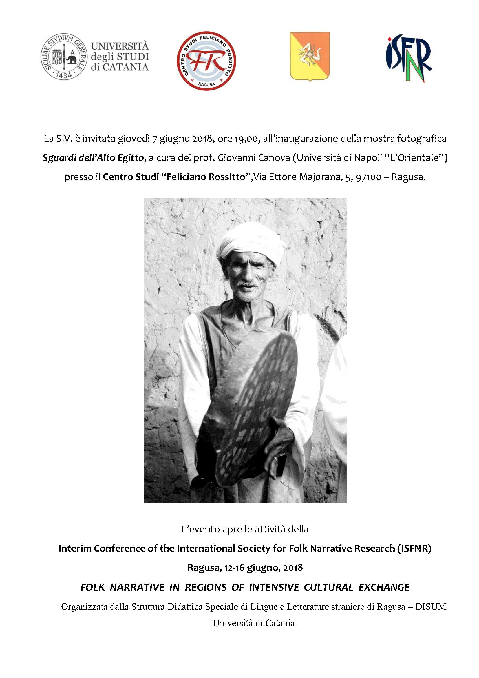 L’evento apre le attività della Interim Conference of the International Society for Folk Narrative Research (ISFNR) che si terrà a Ragusa dal 12 al 16 giugno nell’ambito della Folk Narrative in Regions of Intensive Cultural Exchange organizzata dalla Struttura Didattica Speciale di Lingue e Letterature straniere di Ragusa e il Department of Human Sciences (DISUM) Università di Catania.