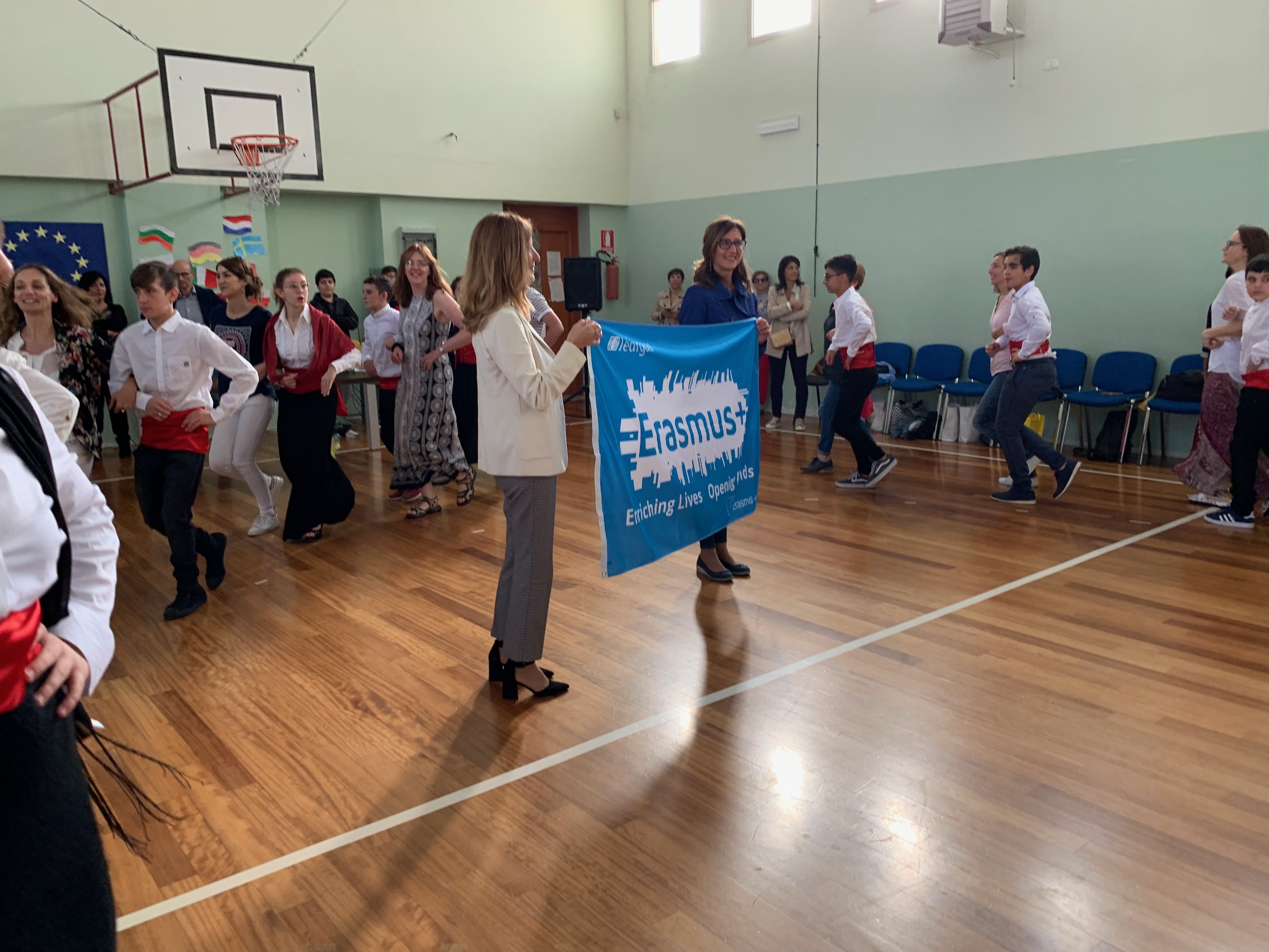 Arrivano sindaco e assessore e comincia l’omaggio folcloristico con balli e canti. Spontaneamente tutti partecipano al ballo. Ed ecco da dove cominciano gli scambi culturali, dalla curiosità e dalla voglia di imparare la cultura degli altri, dall’essere aperti e pronti alla condivisione e allo scambio reciproco di esperienze. La preside legge un discorso di benvenuto in inglese e poi in italiano e i responsabili di ogni nazione si presentano. Sembrano già tutti amici, e del resto alcuni si sono già incontrati nei momenti precedenti in ambito Erasmus (Irlanda, Polonia, Mogliano). La vicepreside Salvina Di Natale è ancora un po' preoccupata: «ce la faremo?» ci dice, e noi la tranquillizziamo: è palese l’aria di amicizia e collaborazione, andrà tutto bene (ed in effetti, ora lo possiamo dire, con lei: avevamo ragione).