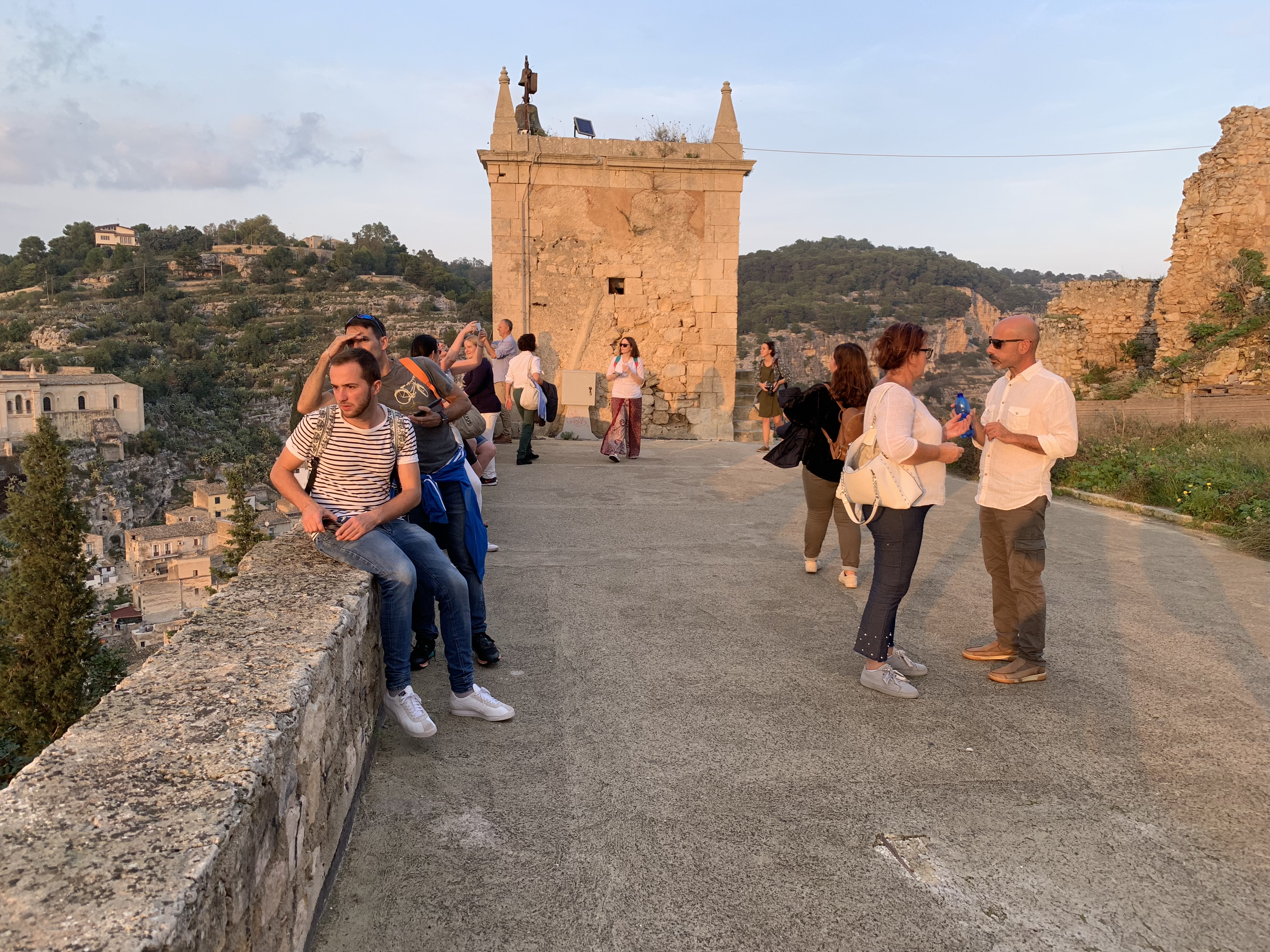 Pranzo insieme, poi dopo la pausa giù verso Marina di Ragusa. Attratti dal mare, non c’è dubbio: fine ottobre e c’è ancora gente che fa il bagno… Poi si parte per Scicli (da notare che il giorno prima gli insegnanti avevano visitato anche la bellissima città di Modica). Desireé (guida di Tanit) ci guida tutti verso la collina, verso San Matteo, l’antica chiesa madre, nel luogo in cui sorgevano pure le torri del Castello di Scicli. Arrivati in quella che fu una specie di “acropoli” nel medioevo, la vista dell’intera città che Vittorini definì “forse, la più bella del mondo”. «È affascinante – dice Lauretta Corridoni, dirigente della scuola Giovanni XXIII di Mogliano – si respira storia ovunque», e di storia antica e moderna accenniamo noi e la guida. Poi giù a visitare palazzi storici: Palazzo Bonelli Patané, con le splendide stanze e i dipinti, di fronte Palazzo Spadaro e l’Antica Farmacia Cartia. Alla fine, lo shopping è immancabile, prima della cena comune, sempre a Scicli.