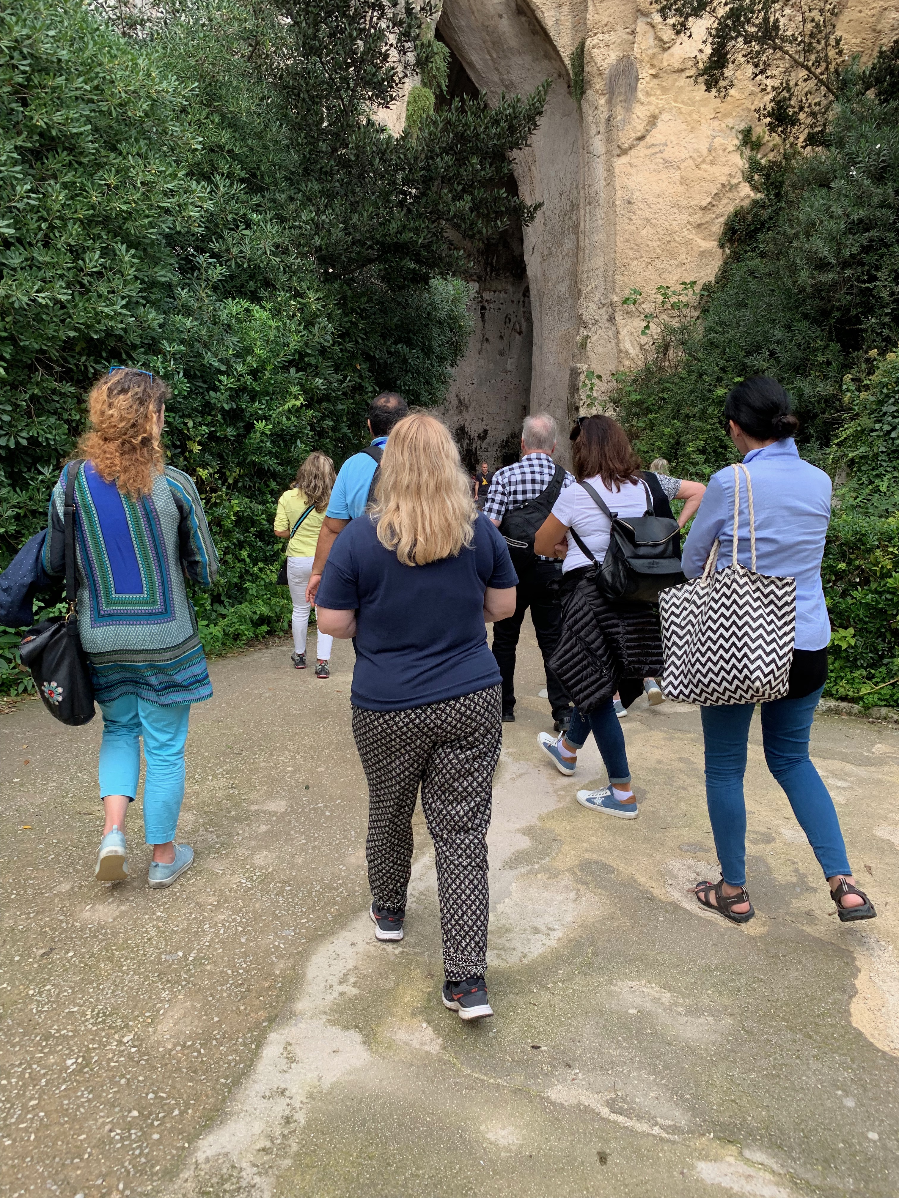 Il progetto Erasmus plus non è solo workshop ma anche scambio culturale e visita ai luoghi più importanti del territorio. E dunque non poteva mancare la splendida Siracusa, visitata domenica 21 ottobre. Ci accoglie Pietro Piazza e con maestria ci guida al Museo Paolo Orsi, descrivendo un percorso archeologico che va dal bronzo antico alla civiltà ellenistica, per Siracusa e per altre città della Sicilia. Il prof. Immanouil si sente a casa, pensando alla sua Creta: «Rivedo anche Iraklion, qui dentro», dice. E non ha torto. E sembriamo tutti un po’ greci e cretesi mentre ci avviamo poi verso la Neapolis e stanchi ci sediamo nei gradini del Teatro Greco. «Sembra anche di rivivere quella storia» dice Renata (Mogliano). Vediamo il Ninfeo, poi ascoltiamo le due (o forse tre versioni) sulla storia e leggenda dell’Orecchio di Dionisio, e le latomie, in una splendida vegetazione, facendo innumerevoli foto per immortalare ricordi. Poi giù verso Ortigia. Traversiamo a piedi il ponte sul mare, poi il pranzo e dopo ancora tutti insieme per le viuzze medievali, verso la Giudecca, luogo affascinante e quasi misterioso, che parla di ebraismo e cristianità, di religione e cultura, di “siracusanità” anche.