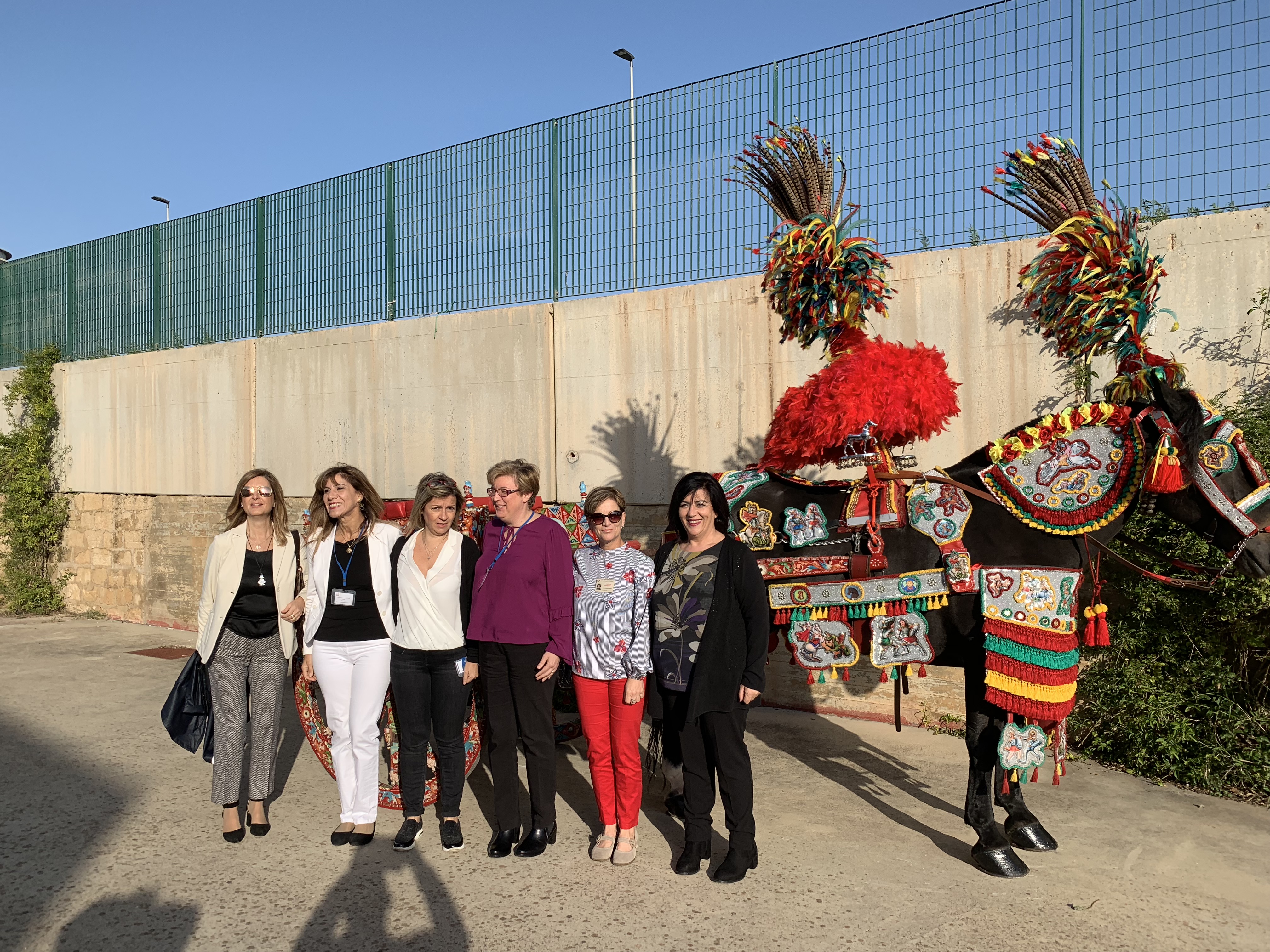 Appena arrivati, due curiosità per le immancabili foto: la Vespa d’annata e il bel carretto siciliano con i “paladini di Francia” illustrati, su cui alcune entusiaste insegnanti hanno espresso il desiderio di salire, perché non è comune vedere una simile opera d’arte, con un cavallo vero, poi. «Pensavamo che fosse solo un carro – ci dice Eva, della delegazione polacca – ma questo è un libro illustrato, bello e significativo».