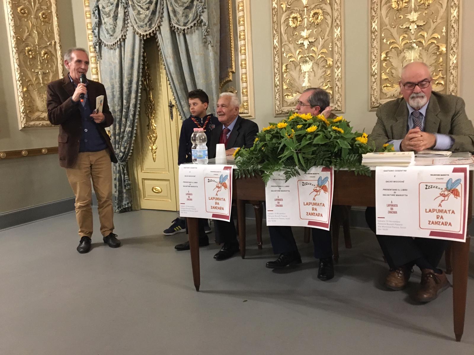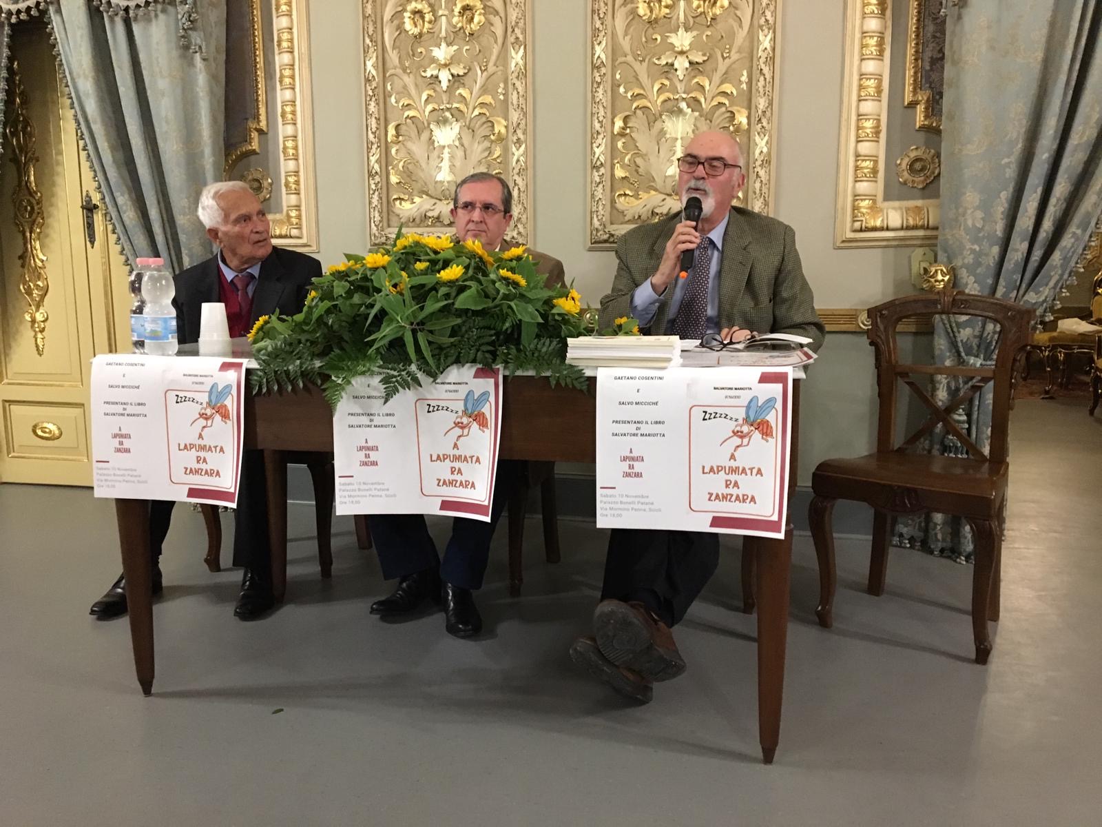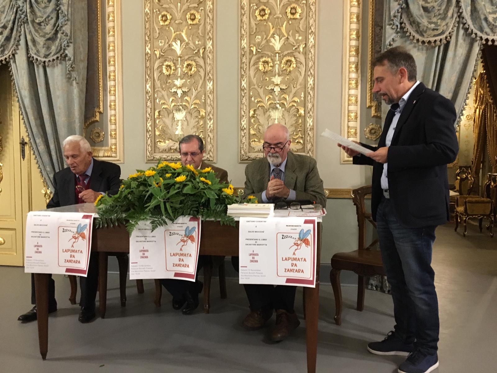 Libro intrigante e lieto, quello presentato ieri sera a Palazzo Bonelli Patanè a Scicli. “A lapuniata ra zanzara” di Culex, alias il prof. Salvatore Mariotta. 26 sonetti in dialetto sciclitano, di cui due a firma di anonimi e dilettanti scrittori. In gran parte pubblicati dal Giornale di Scicli tra gli anni ’70 e ’80. A presentare il libretto (44 pagine) il prof. Gaetano Cosentini e Salvo Miccichè. Relazioni molto interessanti dal punto di vista semantico e utili nel ricostruire la microstoria politica e di costume degli anni 70 e 80 a Scicli. A leggere o rileggere i sonetti si “gusta” soprattutto la lingua utilizzata, le inattese metafore; ma sono soprattutto i personaggi a cui sono dedicati a riemergere nella loro umanità, nei vizi (politici) e nelle virtù.