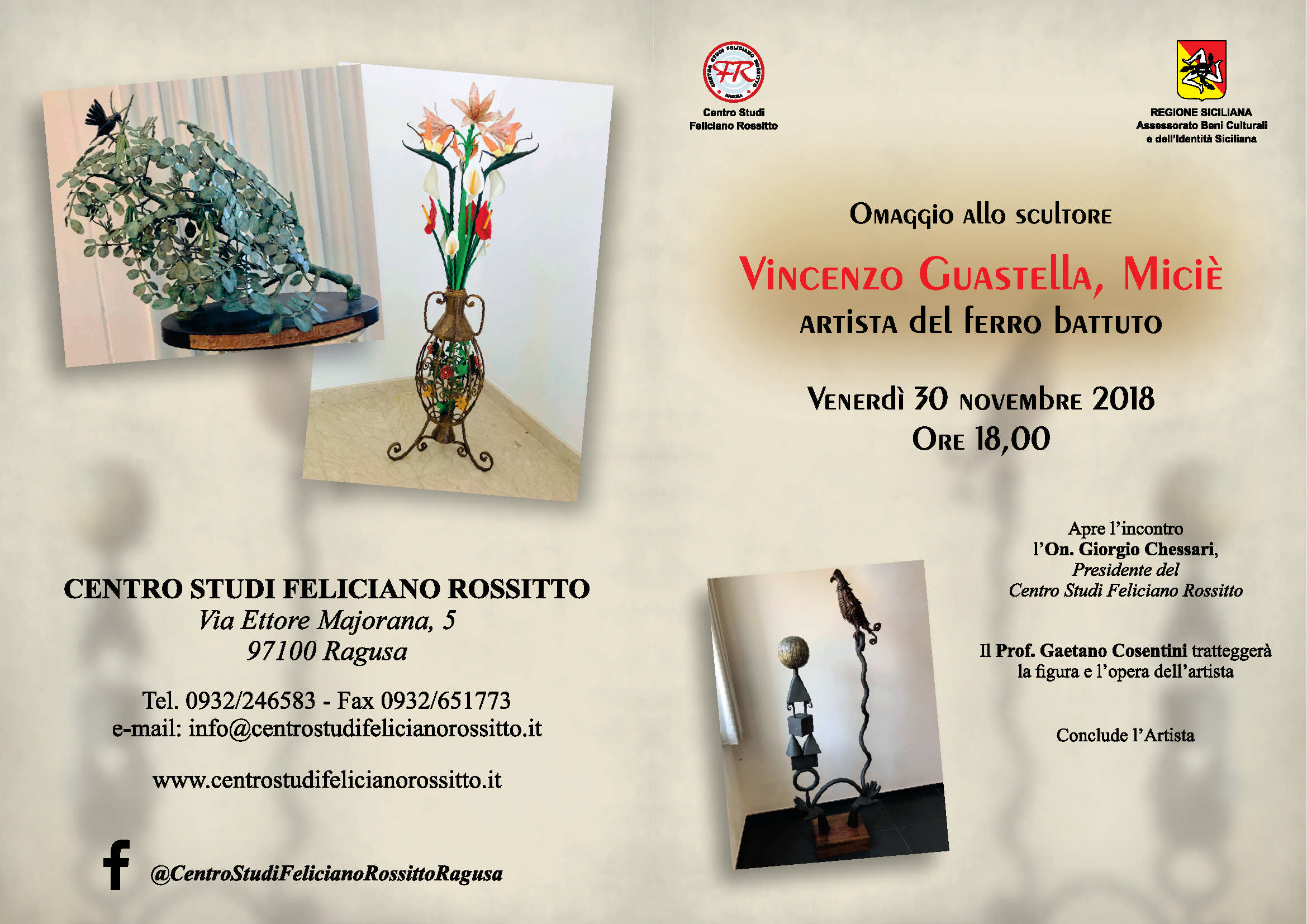 Ragusa, 26 novembre 2018 – Venerdì 30 novembre 2018, alle ore 18, presso il Centro Studi “Feliciano Rossitto” (Via Ettore Majorana, 5 – Ragusa), gli Amici ed estimatori incontreranno Vincenzo Guastella, Miciè, artista del ferro battuto. L’introduzione alla serata sarà affidata Giorgio Chessari (presidente del Centro Studi Feliciano Rossitto).