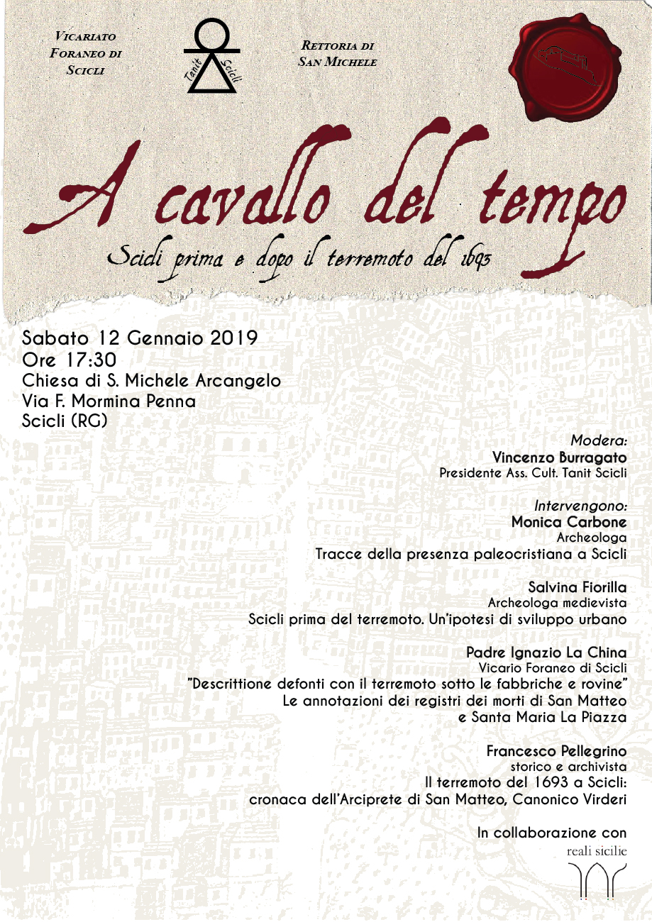 A cavallo del tempo sarà il primo di una serie di incontri culturali che Tanit Scicli promuoverà per la conoscenza della nostra città, dedicato a coloro desiderosi di conoscerne le origini e le evoluzioni attraverso i secoli, con lo scopo di focalizzare le ricerche verso una storia che ogni giorno si veste di nuovi e inediti capitoli.