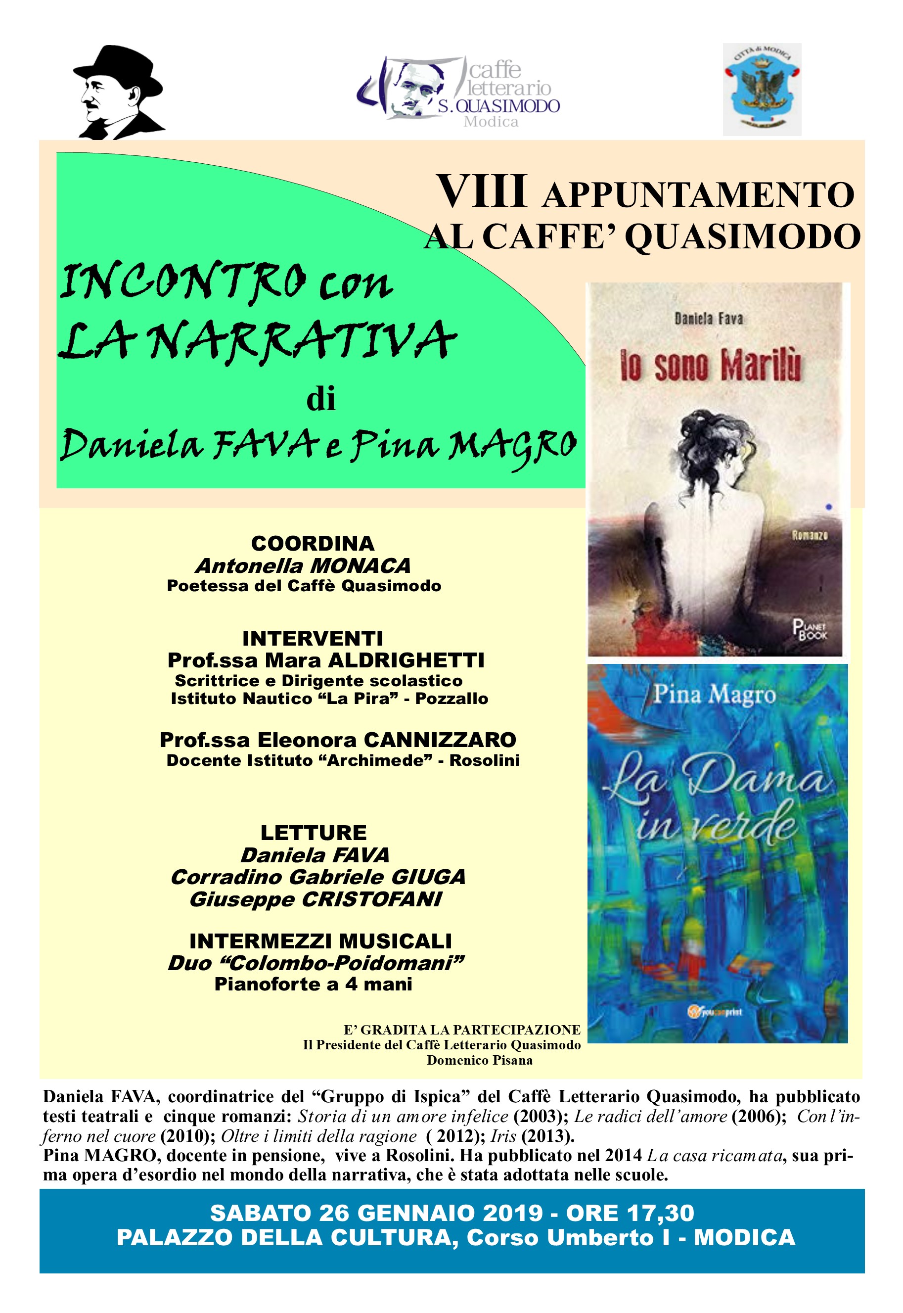 A illustrare l’opera di Daniela Fava, coordinatrice del “Gruppo di Ispica” del Caffè Letterario Quasimodo e già autrice di 5 romanzi, sarà la scrittrice Mara Aldrighetti, Dirigente scolastico dell’Istituto Nautico “G. La Pira” di Pozzallo, mentre Eleonora Cannizzaro, docente nell’Istituto Tecnico “Archimede” di Rosolini, si soffermerà sui racconti di Pina Magro.