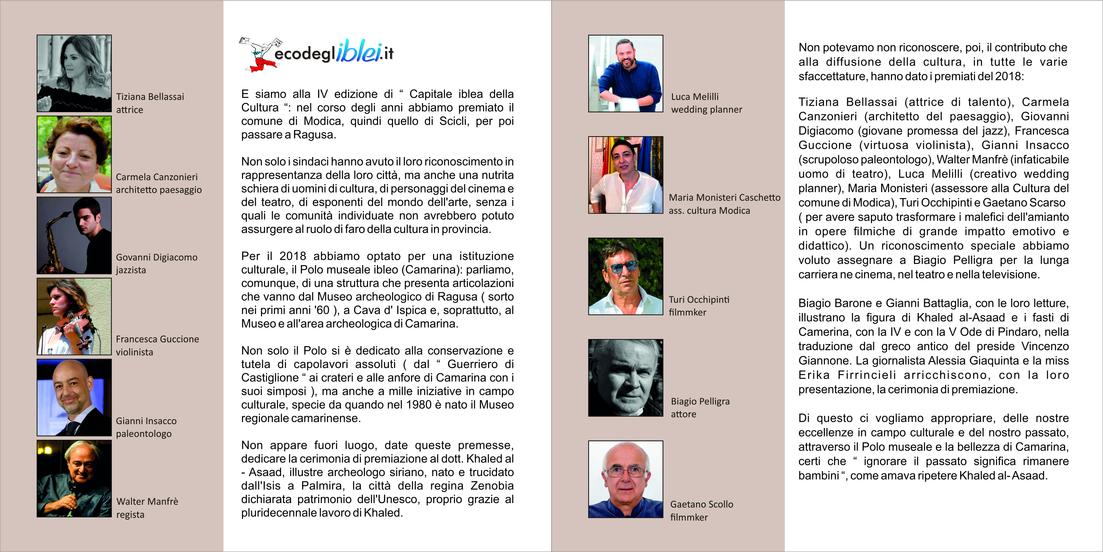 Biagio Barone e Gianni Battaglia, con le loro letture, illustreranno la figura di Khaled al- Asaad e i fasti di Camarina, con la IV e con la V Ode di Pindaro, nella traduzione dal greco antico del preside Vincenzo Giannone. La giornalista Alessia Giaquinta e la miss Erika Firrincieli arricchiranno, con la loro presentazione, la cerimonia di premiazione.