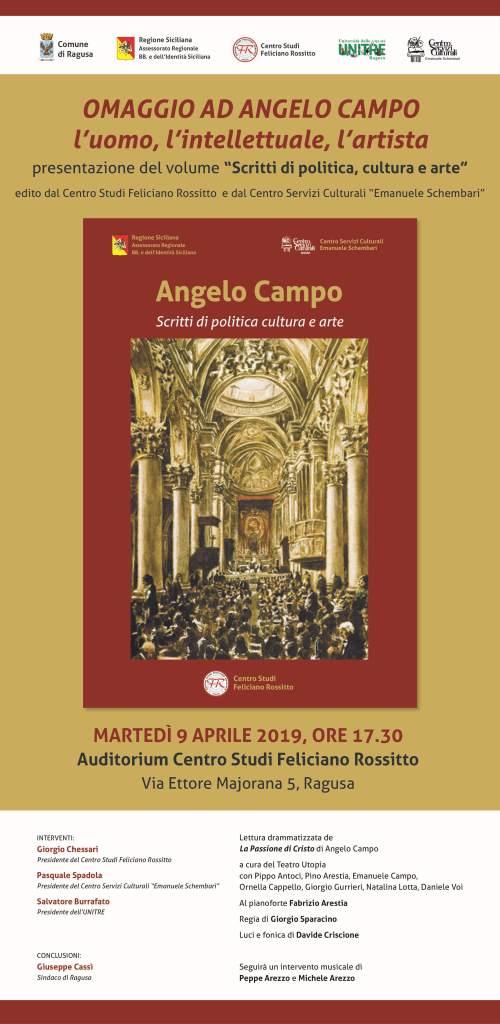 Angelo Campo, scomparso a dicembre 2007, è stato uno dei maggiori intellettuali di Ragusa, contribuendo alla promozione della vita culturale e partecipando alla fondazione di tanti sodalizi nel campo della pittura, del teatro e dell’arte culinaria. È stato tra i promotori di “Cronache di una Provincia”, direttore responsabile per oltre un decennio di “Pagine del Sud” (edito dal Centro Studi “Feliciano Rossitto”, ha pubblicato molti articoli sui protagonisti della vita artistica, musicale e culturale del territorio ibleo. Si è occupato anche di teatro, scrivendo “La passione di Cristo” e curando la regia di varie opere.