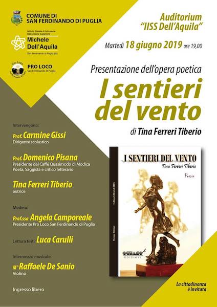 “Ringrazio la poetessa Tina Ferreri Tiberio, la Pro loco e il comune di San Ferdinando di Puglia , afferma Domenico Pisana , per avermi voluto coinvolgere in questa iniziativa di presentazione del libro. Ritengo di poter dire che questa silloge è un cammino poetico nel quale soffia un “vento” che si prefigge di indirizzare il lettore nella direzione di un’umanità che cerca riscatto, nella direzione di una responsabilizzazione delle coscienze, invitando la ragione ad aprirsi al Trascendente e il cuore a lasciarsi illuminare dalla fede e dal ‘vento dello spirito’ mentre – come dice la poetessa – ‘…Il cielo si colora / di pura sorgente / e flette brezze / di dorati giorni’…”