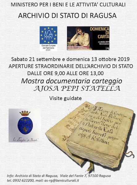 Ragusa, 18 settembre 2019 – Il direttore dell’Archivio di Stato di Ragusa, Giovanni Calabrese, rende noto che in occasione delle manifestazioni “Giornate Europee del Patrimonio 2019” e “Domenica Carta 2019”, promosse dal Ministero per i Beni Culturali, nei giorni di sabato 21 settembre e domenica 13 ottobre 2019, l’archivio rimarrà aperto dalle 9 alle 13 e sarà visitabile con visite guidate. Verrà esposto materiale proveniente dall’Archivio Ajosa Pepi Statella, di recente acquisizione. Si tratta di un interessante carteggio tra nobili famiglie siciliane.