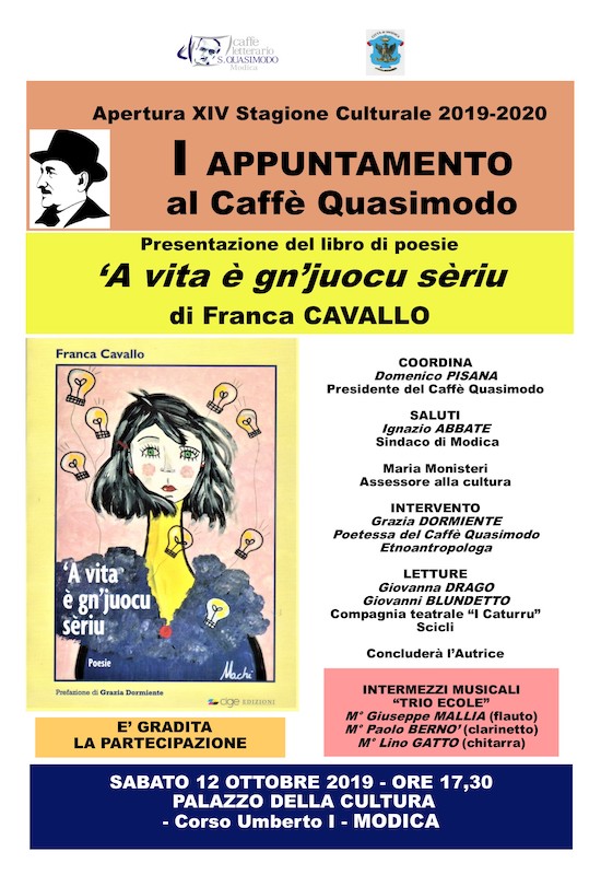“Con questa XIV stagione dei ‘sabati letterari’, il Caffè Quasimodo di Modica - afferma Domenico Pisana - continua la sua animazione culturale a servizio del territorio ibleo; l’apertura l’abbiamo voluta dedicare alla poetessa Franca Cavallo, la quale con questa ultima silloge vede arricchire il suo itinerario poetico iniziato nel 2000, e peraltro confermato da riconoscimenti recentemente ricevuti in Calabria, e a Partanna, in Sicilia. In questo libro l’autrice, con un dialetto affabulante e fortemente radicato nella nostra tradizione modicana, offre al lettore una dolente meditazione sulla vita nelle sue multiformi espressioni, cogliendone gli aspetti antinomici e le contraddizioni nel quadro di una “società delle solitudini” ove - come recita il titolo di una poesia - “A vita è sulu ‘n’opira ri pupi!” La raccolta – conclude Pisana – si caratterizza anche per il suo apparato iconografico che riprende opere pittoriche di Chiara Manenti e foto di Giulio Lettica”.