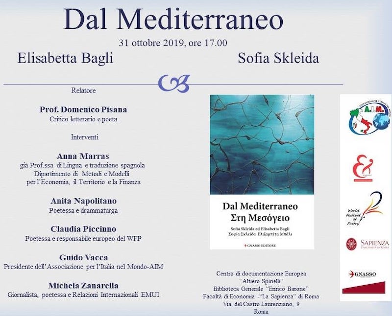 Tema del convegno l’opera poetica di Elisabetta Bagli, italo-spagnola, e Sofia Skleida, greca, dal titolo “Dal Mediterraneo”. Pisana relazionerà sull’opera, della quale anche curato la prefazione.