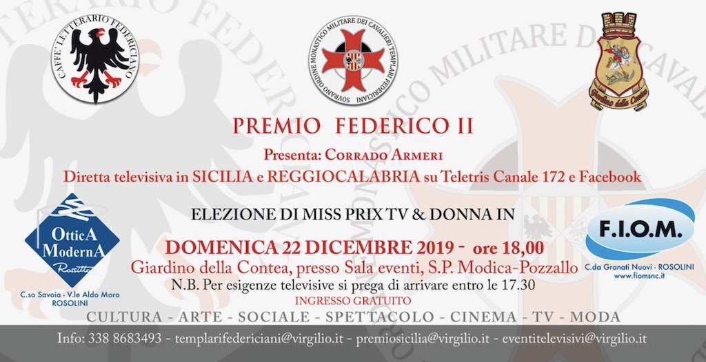 Modica, 11 dicembre 2019 – Si svolgerà al Giardino della Contea (Strada provinciale Modica-Pozzallo), domenica 22 dicembre a partire dalle 18 la serata del Premio Federico II, organizzato da Caffè Letterario Federiciano e Sovrano Ordine Monastico Militare dei Cavalieri Templari Federiciani.