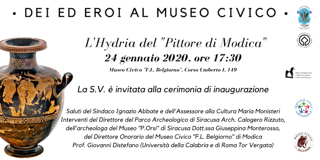 Modica, 16 gennaio 2020 – Al Museo Civico “Franco Libero Belgiorno” (Corso Umberto I 149, Modica) il 24 gennaio 2020 alle 17:30, sarà inaugurata la mostra “L’Hydria del ‘Pittore di Modica’ - Dei ed Erori al Museo Civico”.